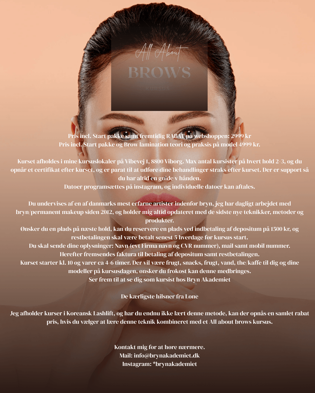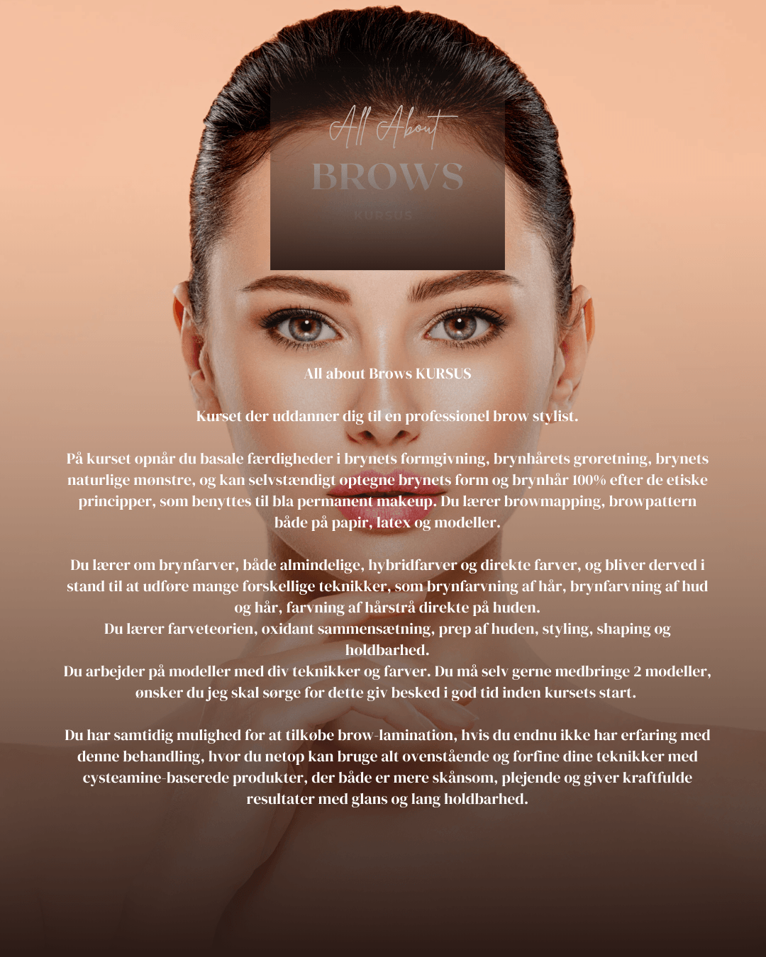 I dette kursus opnår du de samme færdigheder i at forme og style de smukkeste bryn - som en permanent makeup artist og erfarer at verdensmester bliver man ikke blot på en kursus dag, men med dine nye værktøjer og teknikker, kan du straks efter kurset forme de flotteste bryn og med den teori indenfor farver med sikkerhed vide, hvilken der matcher din kundes ønske, hud og livsstil.